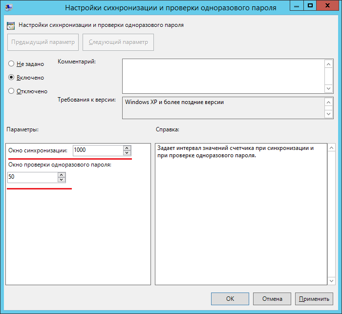 Задает интервал значений счетчика при синхронизации и при проверке одноразового пароля.