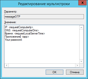 • Дополнительный текст перед OTP — произвольный текст сообщения, предшествующий одноразовому паролю. По умолчанию отправляется только одноразовый пароль, для дополнительной настройки параметров используйте следующие параметры: