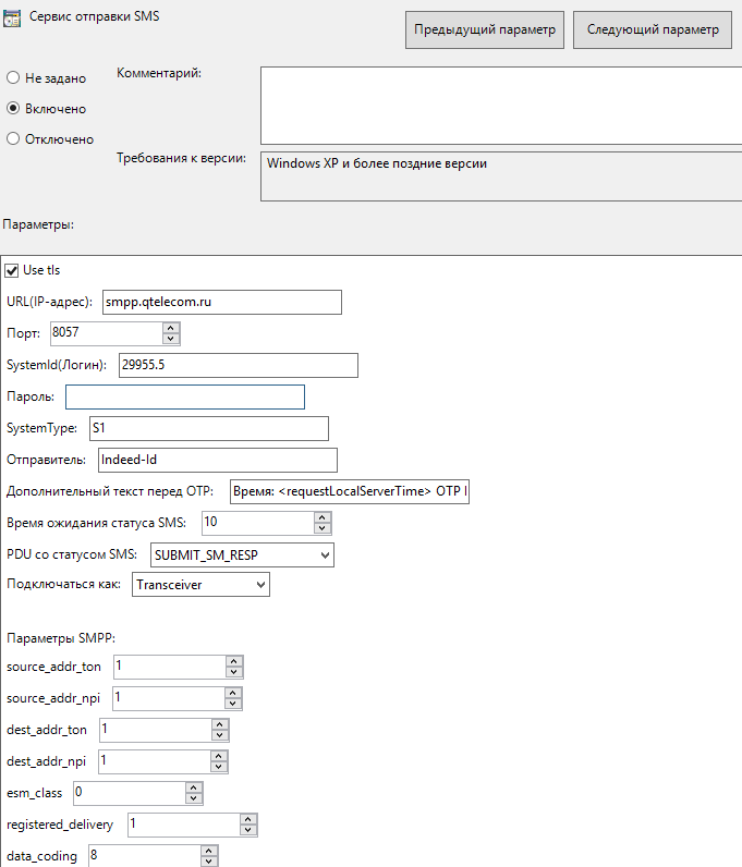 Политика применяется к серверам Indeed AM и определяет следующие настройки для сервера отправки СМС: