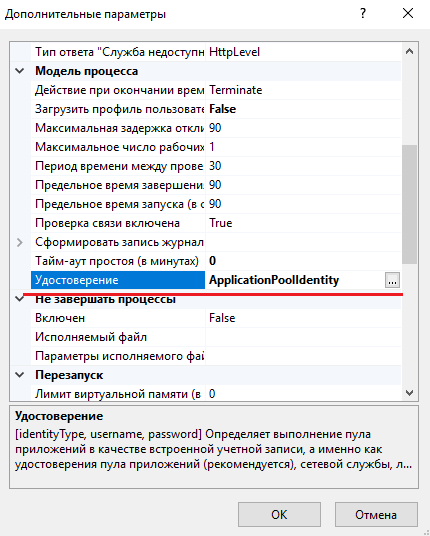 Для параметра useAppPoolCredentials установите значение True и нажмите Применить в блоке Действия.
