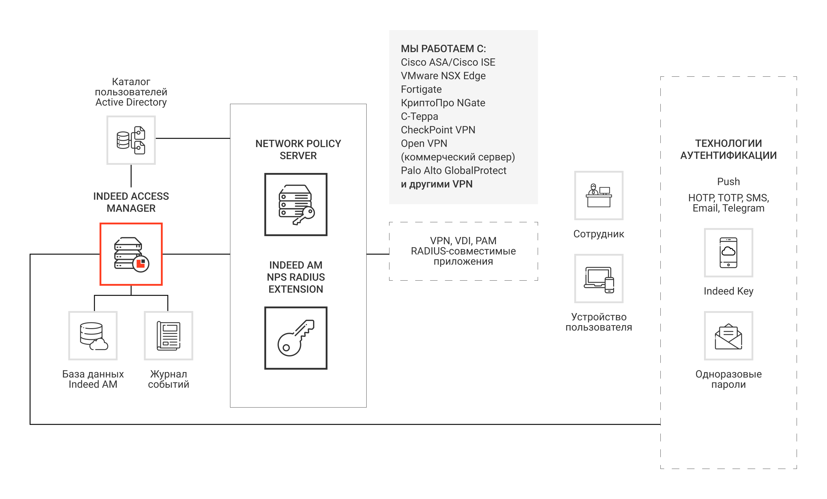 Аутентификация по второму фактору выполняется на сервере Indeed Access Manager и результат проверки через сервер NPS транслируется в целевое приложение.