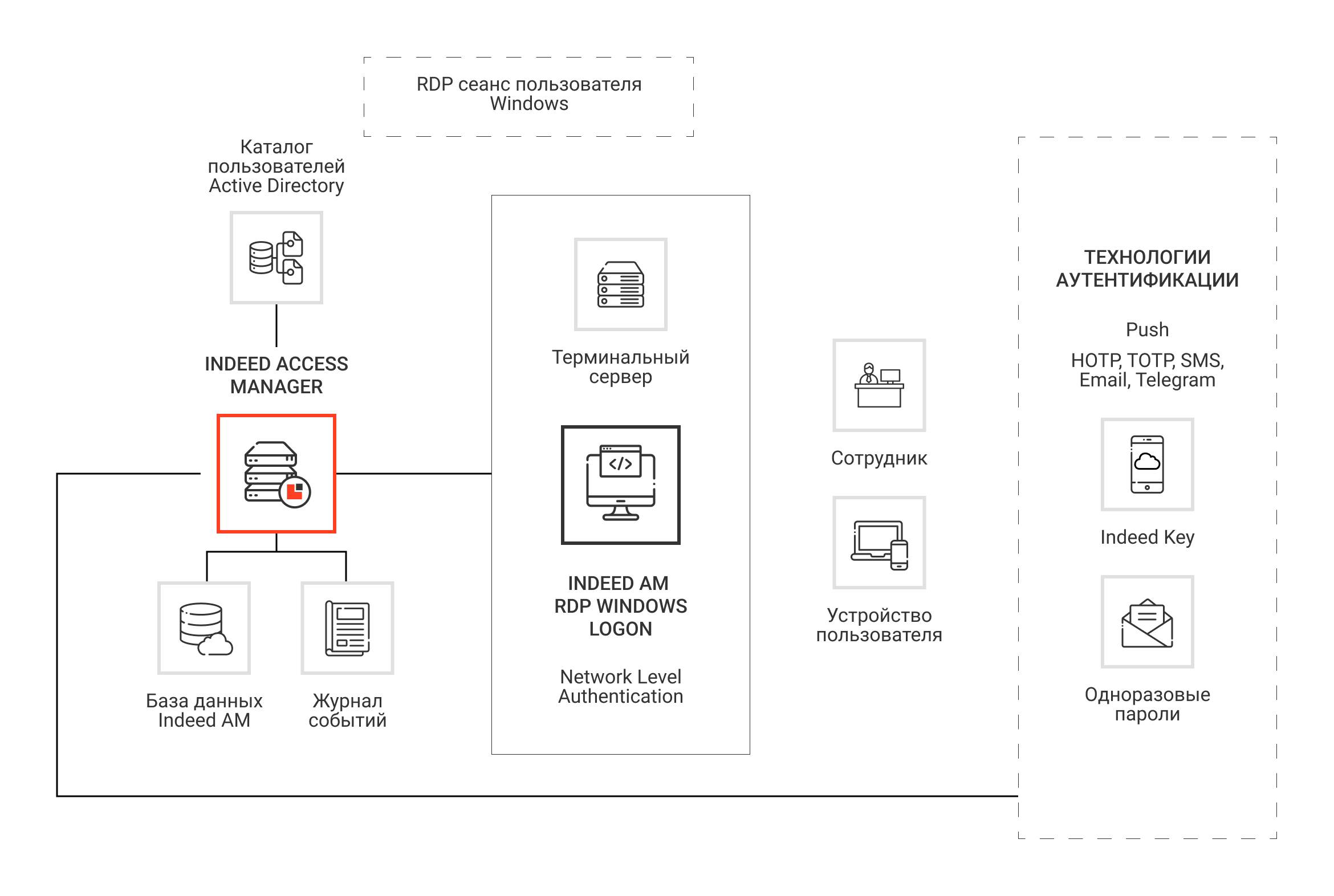 Модуль Indeed RDP Windows Logon (RDP Windows Logon) используется для реализации двухфакторной аутентификации при подключениях по протоколу RDP. В этом случае первым фактором выступает доменный пароль, а вторым — одноразовый пароль (one-time password) или подтверждение входа в мобильном приложении Indeed Key. Одноразовый пароль может быть либо сгенерирован на стороне пользователя в приложении на смартфоне, либо с помощью специального брелока (ОТР-токена), либо отправлен пользователю по СМС или email.