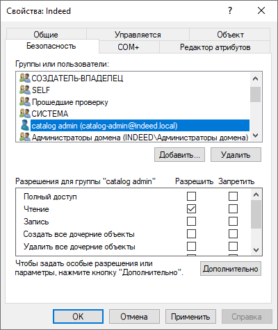 - В разделе Group or user names добавьте созданную ранее сервисную учетную запись.