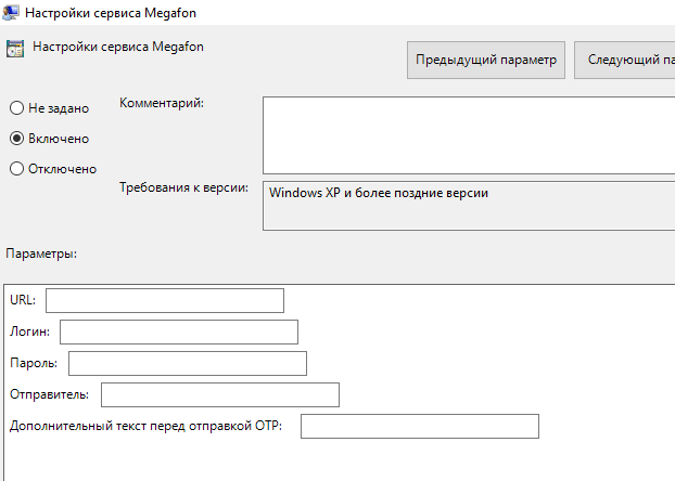 Политика применяется к серверам Indeed AM и определяет настройки для Megafon — сервиса отправки СМС: