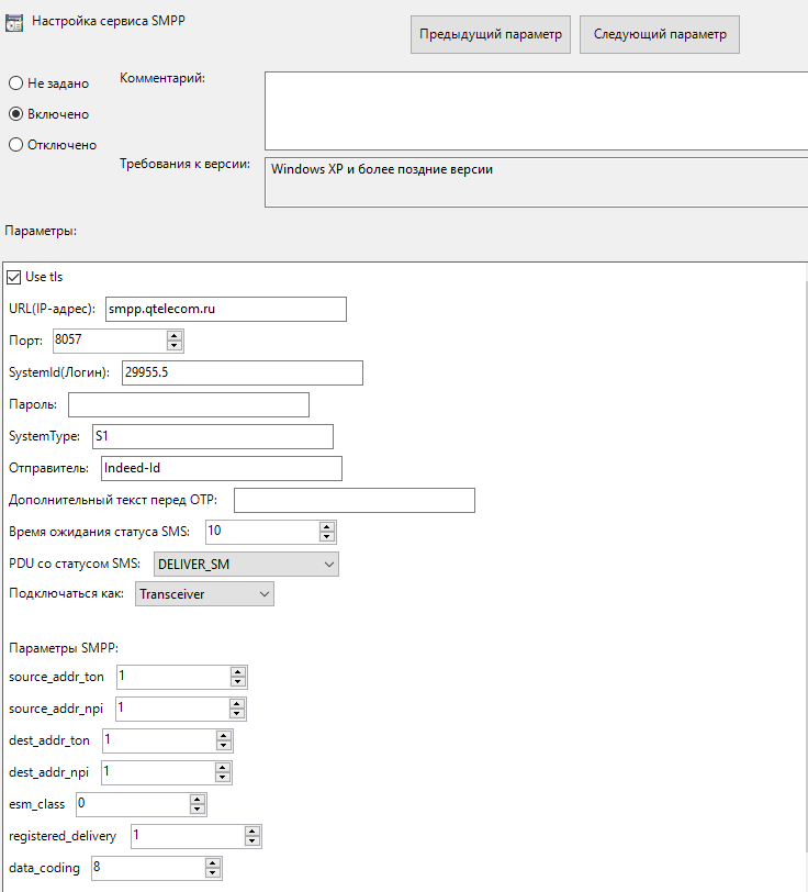 Политика применяется к серверам Indeed AM и определяет следующие настройки для сервиса SMPP: