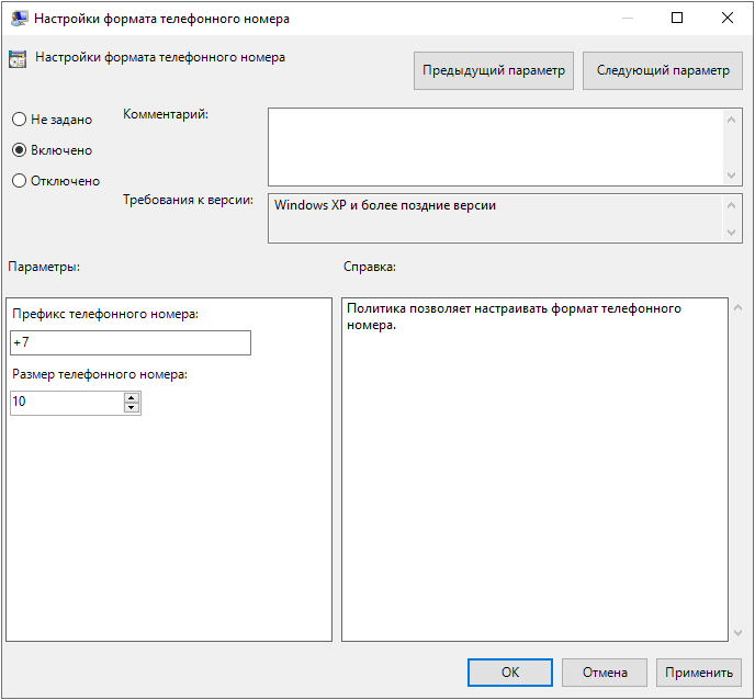 Политика применяется к серверам Indeed AM и позволяет настраивать формат телефонного номера. При включении данной политики включается нормализация телефонного номера. Это означает следующее: