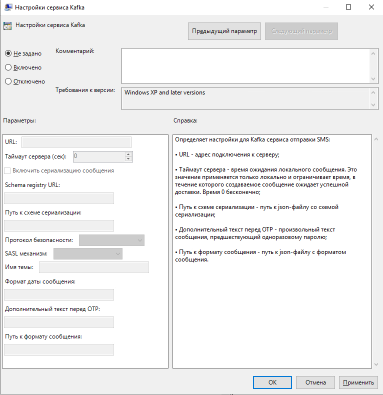 Политика применяется к серверам Indeed AM и определяет настройки для Apache Kafka — сервиса отправки СМС: