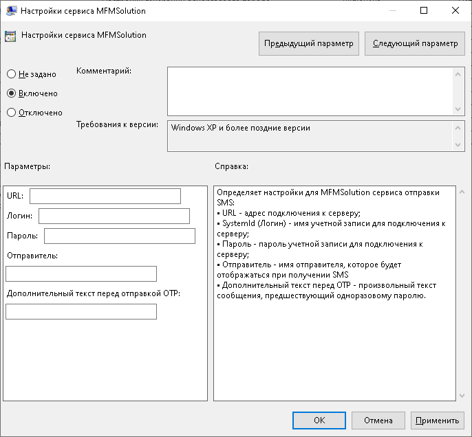 Политика применяется к серверам Indeed AM и определяет настройки для MFMSolution — сервиса отправки СМС:
