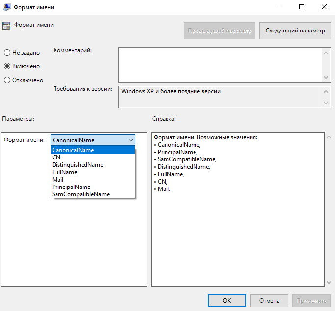 • Формат имени — политика позволяет задать параметр пользователя в качестве имени ОТР-аккаунта, который будет передаваться в QR-коде. Возможные параметры: