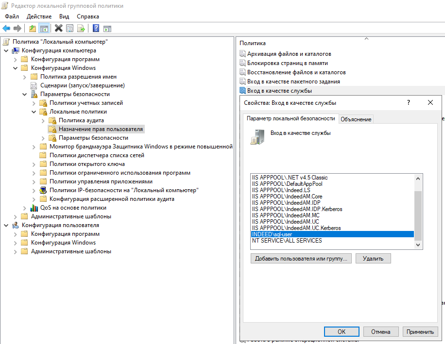 - В списке справа выберите политику Вход в качестве службы.