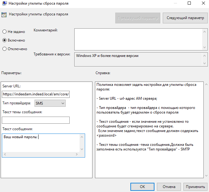 Выберите и настройте политику Настройка утилиты сброса пароля. Для настройки задайте следующие значения: