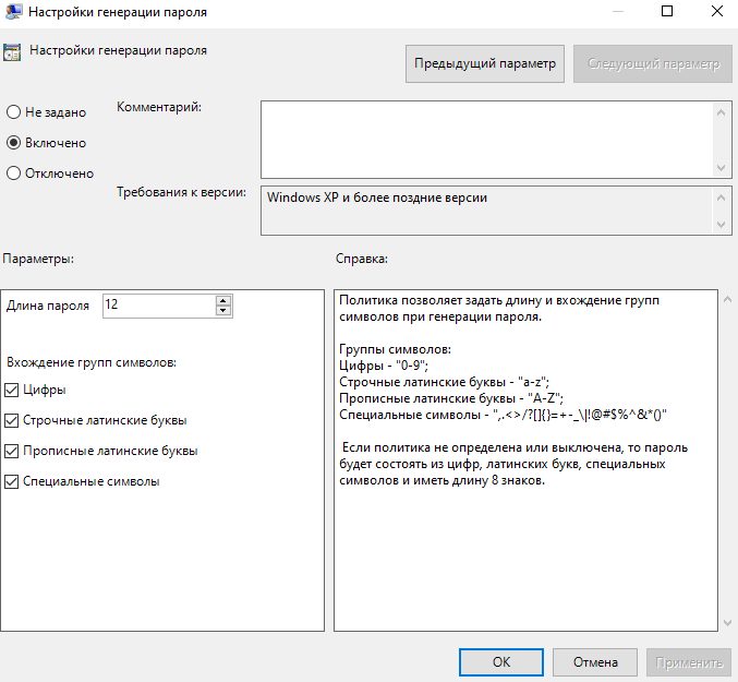 Выберите и настройте политику Настройки генерации пароля. В политике укажите необходимые критерии для генерации пароля.