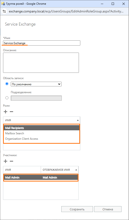 • Mailbox Search — роль для получения электронного адреса. Если этой роли не будет, то под сервисной учетной записью можно будет получить только свой электронный адрес.