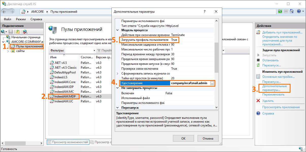 4. В списке выберите IndeedAM.MDP. В открывшемся справа меню выберите Изменить пул приложенийДополнительные параметры.