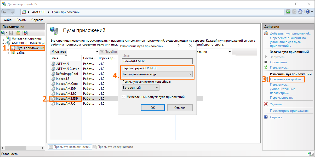 4. В списке выберите IndeedAM.MDP. В открывшемся справа меню выберите Изменить пул приложенийОсновные настройки.