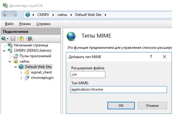 В разделе настроек Типы MIME (MIME Types) добавьте новый тип с расширением .CRX и описанием application/chrome.