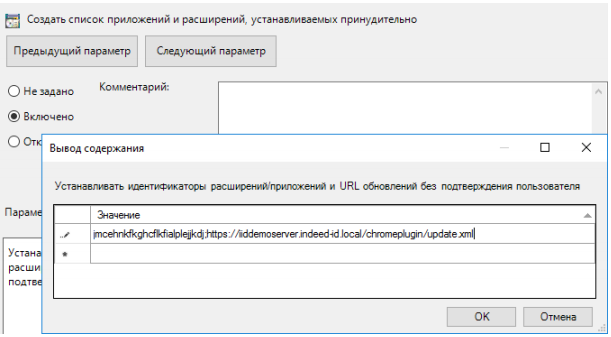 В открывшемся окне укажите идентификатор расширения из имени файла CRX и путь к XML-файлу в каталоге chromeplugin.