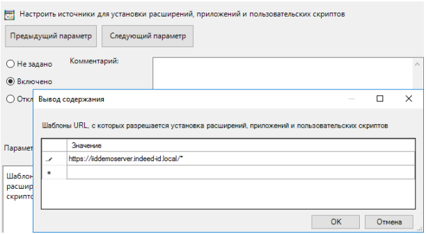 Включите политику Настроить источники для установки расширений, приложений и пользовательских скриптов (Configure extension app, and user script install sources).