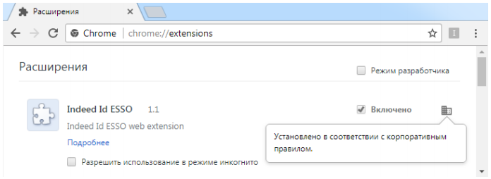 Расширение автоматически загрузится и установится после применения групповой политики к компьютеру пользователя. Может потребоваться до нескольких минут для того, чтобы оно отобразилось в списке установленных в браузере. Установленное через групповые политики расширение отмечено соответствующим символом.