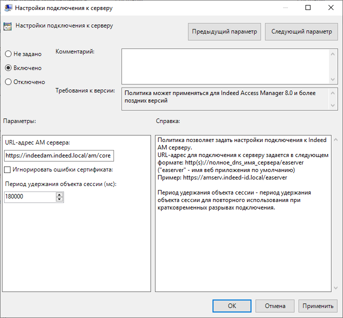 Добавьте политику IndeedID.ServerUrl.admx на компьютер с установленным ESSO Agent. Шаблоны групповых политик расположены в папке Indeed AM <номер версии>\Misc\ADMX Templates.