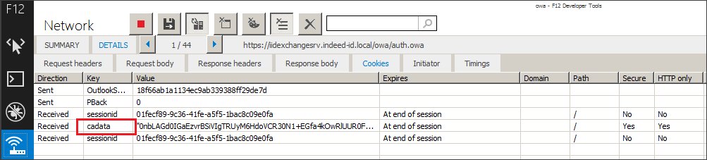 AuthCookie— строковый параметр. Название cookie, которое используется для аутентификации в целевом приложении. Определяется экспериментальным путем для каждого приложения. Чтобы получить значение параметра из консоли F12 IE Developer Toolbar:В разделе Сеть (Network) запустите Сбор сетевого трафика (Enable network traffic capturing).