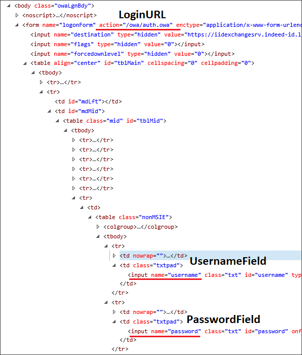 Значения всех параметров — LoginURL, PasswordField,