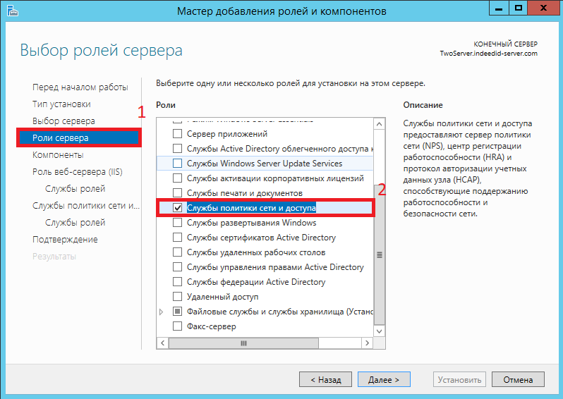 5. На вкладке Роли сервера выберите роль Службы политики сети и доступа (Network Policy and Access Services), согласитесь с установкой дополнительных компонентов.