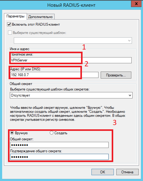 4. В окне Новый RADIUS-клиент задайте настройки клиента: