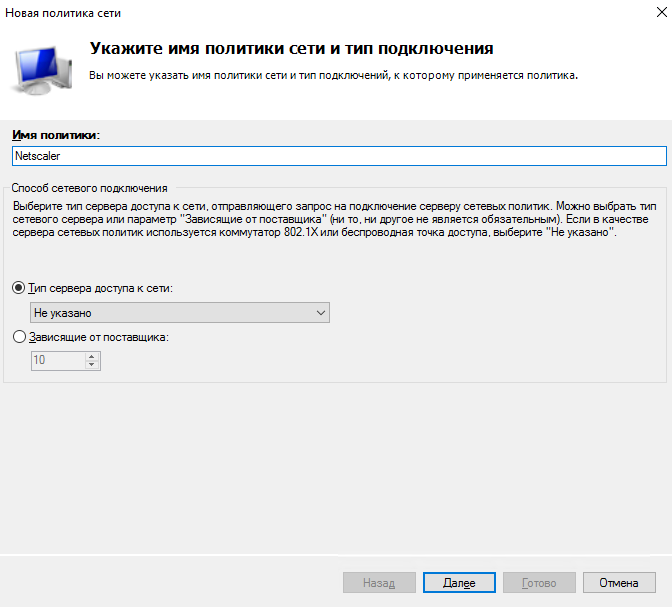 5. В окне Укажите условия добавьте условия, которые будут проверяться при подключении клиентов. Для этого нажмите кнопку Добавить... и выберите подходящее условие. После добавления условия нажмите Далее.