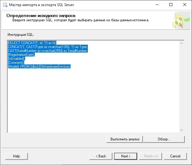 Общая особенность экспорта — конвертирование формата идентификаторов записей таблиц из nvarchar(128) и nvarchar(max) в uniqueidentifier.