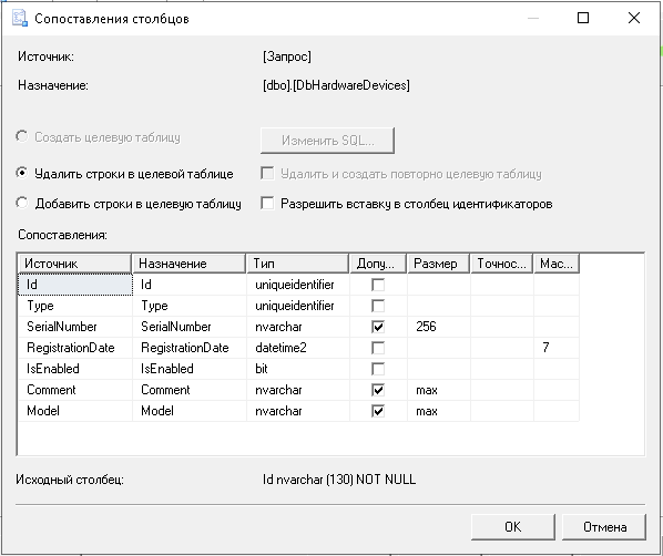 2. В настройках маппинга на этом же экране укажите, что нужно удалять данные из таблицы-приемника.