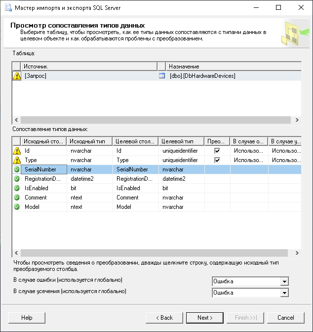 3. Далее проверьте набор полей. Вы увидите предупреждения о конвертировании данных.
