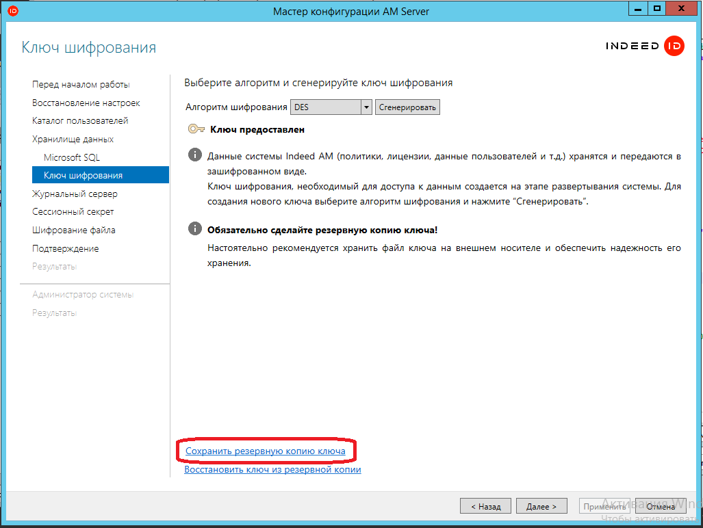 2. Пройдите в нём без изменений полей до создания ключа шифрования и сохраните резервную копию ключа