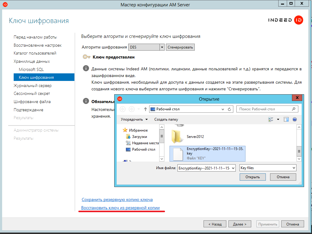 5. Создайте иерархию таблиц в БД с помощью Мастера конфигурации, при создании используйте полученный ключ шифрования с Indeed AM 7.x
