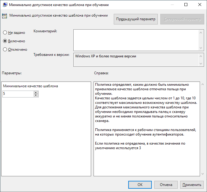 Политика определяет, каким должно быть минимально приемлемое качество шаблона отпечатка пальца при обучении. Качество шаблона задается целым числом от 1 до 10, где 10 соответствует максимально возможному качеству шаблона.