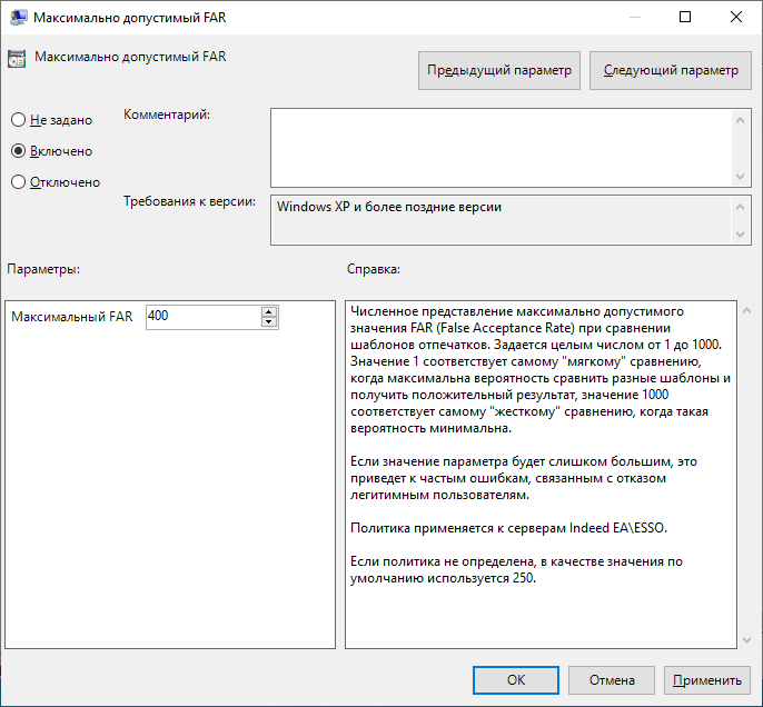 Политика определяет максимально допустимое значение FAR (False Acceptance Rate) при сравнении шаблонов отпечатков.