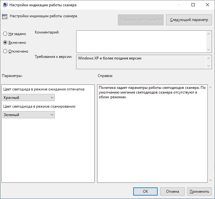 Политика задает параметры работы светодиодов сканера. По умолчанию мигание светодиодов сканера отсутствуют в обоих режимах.