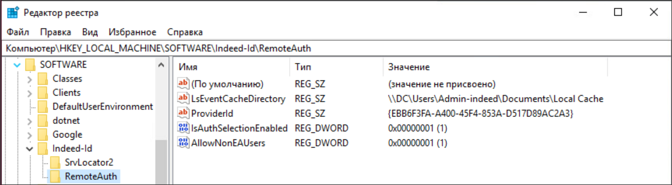 В разделе HKEY_LOCAL_MACHINE\SOFTWARE\Indeed-ID\RemoteAuth создайте параметр