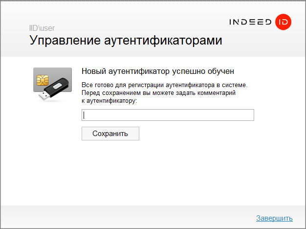 3. После регистрации аутентификатора в окне Управление аутентификаторами отображается сообщение Новый аутентификатор успешно обучен. Можно добавить произвольный текстовый комментарий к зарегистрированному аутентификатору, если данное действие разрешено администратором системы.