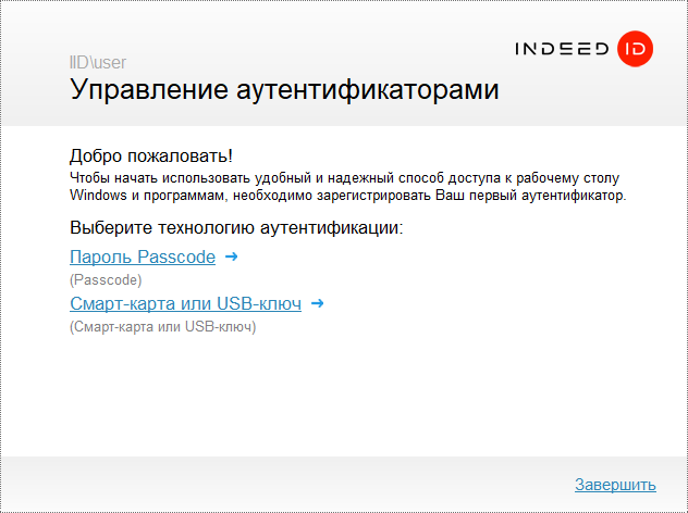 • Чтобы войти в систему без регистрации аутентификатора, нажмите Завершить. В этом случае Мастер первого входа будет отображаться при каждом следующем входе в систему до регистрации первого аутентификатора.