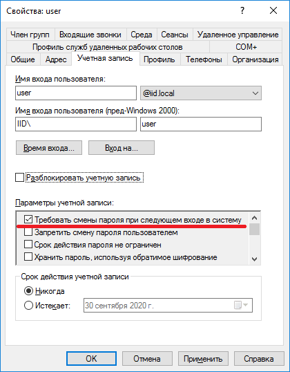При использовании модуля Windows Logon можно задать генерацию случайного пароля для пользователя в Active Directory. Для работы этой настройки в свойствах пользователя в Active Directory отключите опции Запретить смену пароля пользователя и Срок действия пароля не ограничен.