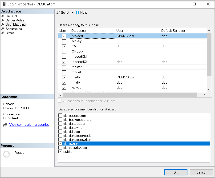 - Выдайте права на работу с базой для выбранного имени входа. Укажите разрешения db_owner и public и нажмите ОК.