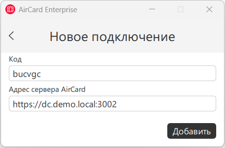 Ввести код, полученный от администратора, и нажать Добавить. Адрес сервера Indeed AirCard Enterprise подставляется автоматически.