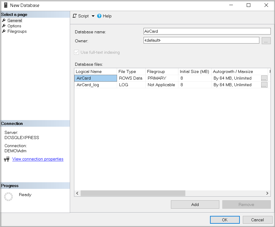 - Укажите Имя базы данных: (Database name:) и нажмите OK.