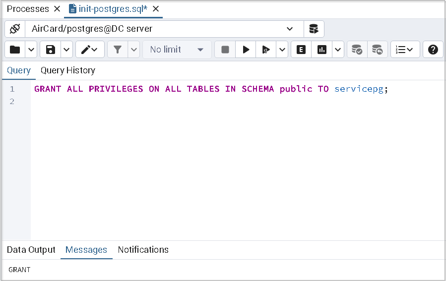 GRANT ALL PRIVILEGES ON ALL TABLES IN SCHEMA public TO <имя сервисной учётной записи>;В меню запросника нажмите Выполнить (Execute/Refresh).