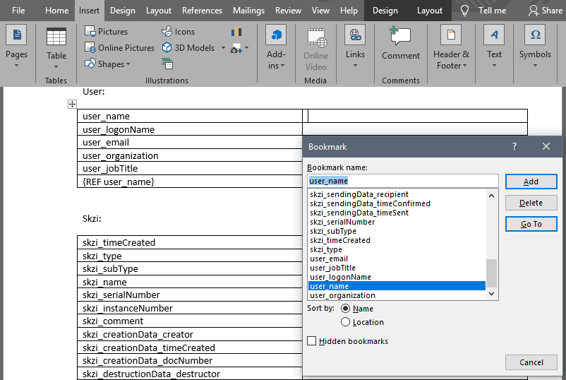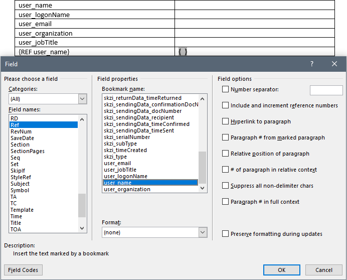 3. В Поля: (Field names:) укажите значение Ref, в Имя закладки: (Bookmark name:) выберите требуемую закладку (user_name) и нажмите ОК.