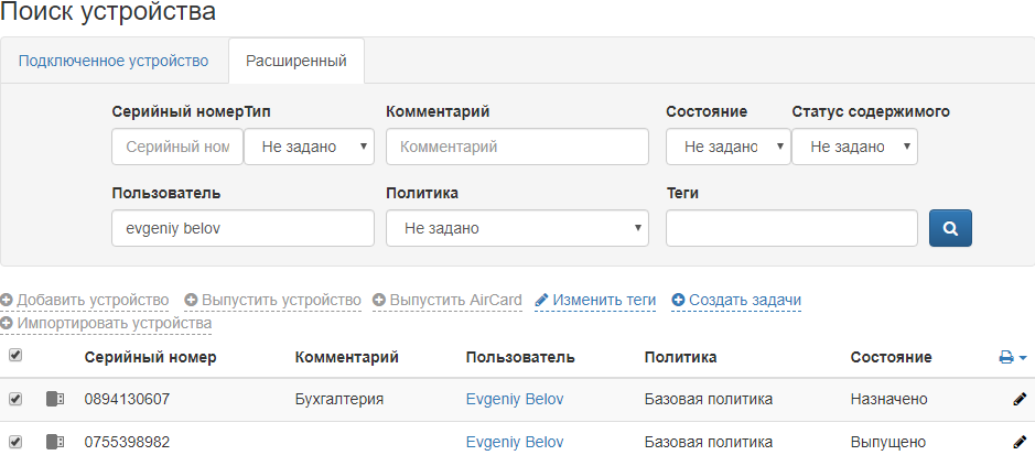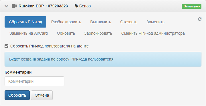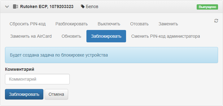 - Блокировка устройства - блокировка PIN-кода пользователя. Задача доступна для устройств в состояниях Выпущено или В ожидании.
