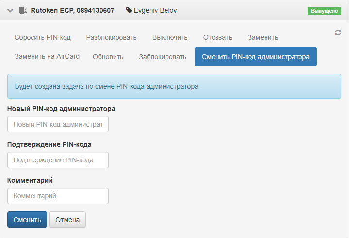 Нажмите Сменить PIN-код администратора в свойствах устройства, задайте и подтвердите Новый PIN-код администатора. Укажите Комментарий при необходимости и нажмите Сменить.