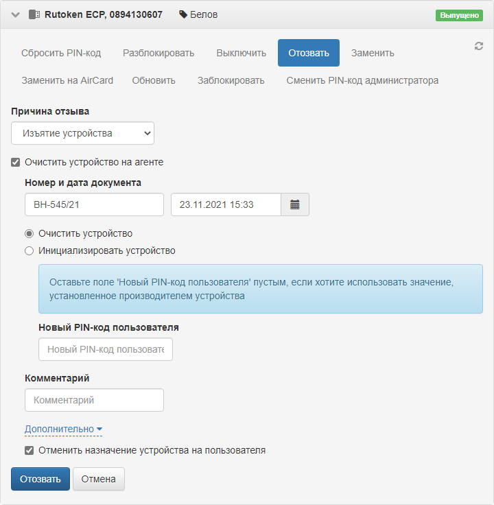 - Укажите Новый PIN-код пользователя, который установится на устройстве после его изъятия. Если не задать PIN-код пользователя, то после изъятия устройства установится PIN-код, указанный в разделе Типы устройств.
