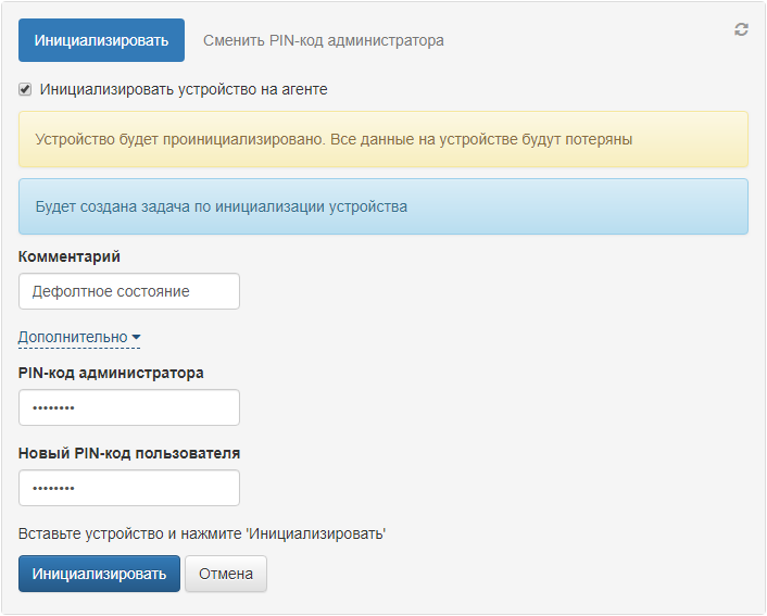 Если PIN-код администратора на устройстве не совпадает с сохраненным в хранилище системы, то укажите его в разделе Дополнительно. Задайте Новый PIN-код пользователя, если требуется его установить в процессе выполнения инициализации, и нажмите Инициализировать.